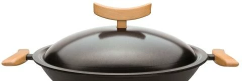 Der Deckel besteht aus Gusseisen und der Griff besteht aus edlem Hartholz.