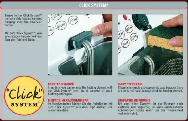 Im Handumdrehen können Sie das Heizelement mit dem Click System® aus dem Topf nehmen und wieder einsetzen. Mit dem Click System® ist das Reinigen noch einfacher und bequemer, da keine unerreichbaren schmutzigen Ecken mehr um das Heizelement vorhanden sind. Alle FRITEL Fritteusen sind zur Reinigung vollständig auseinandernehmbar. Sie sind mit einem Topf aus Edelstahl 18/10 ausgestattet.