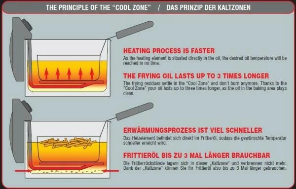 Alle Fritel Fritteusen verfügen über eine Kaltzone. Die Heizung hängt direkt im Frittieröl. Im Handumdrehen erreicht das Öl die richtige Temperatur. Die Frittierrückstände sinken in die Kaltzone und verbrennen nicht mehr. Das Frittieröl hält 3 Mal länger.
