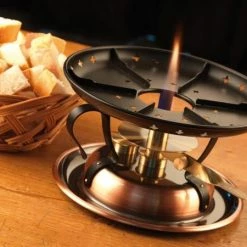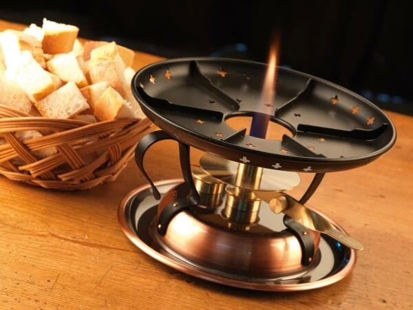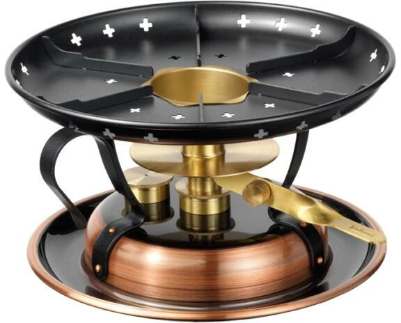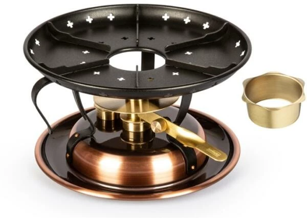 Der klassische Rechaud von Stöckli ist kupfer brüniert, verfügt über einen exakt einstellbaren Spritbrenner mit Docht, einen großen Spritmessbecher, eine Löschkappe mit Kette und praktischerweise auch über eine Tragegriff sowie Windschutz. Der rustikale Rechaud ist Swiss-made!