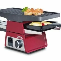 Spring Raclette2+ Basismodul mit Temperaturregler kann mir bis zu 3 Erweiterungsmodulen von Spring zum kompakten Tischgerät ergänzt werden. Die Grillplatte aus Aluminium-Guss ist antihaftbeschichtet. Zur sicheren Aufbewahrung nicht benutzter Pfännchen gibt es einen Halter, aus Edelstahl. Mit 50 cm langen Verbindungskabeln entsteht ein Arrangement längs oder im Kreis für entsprechend große Tische.