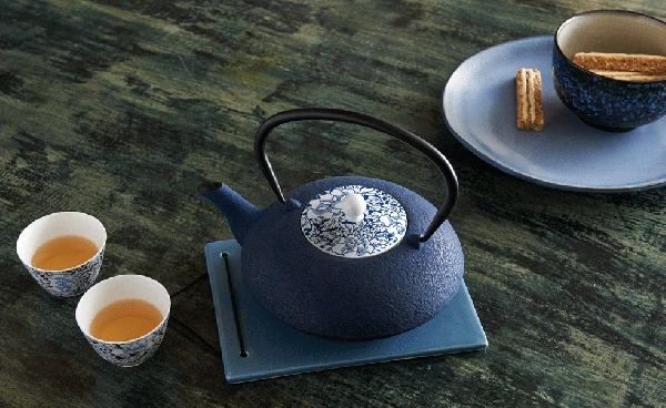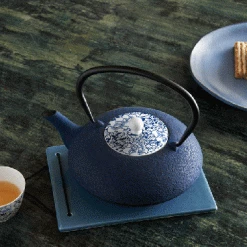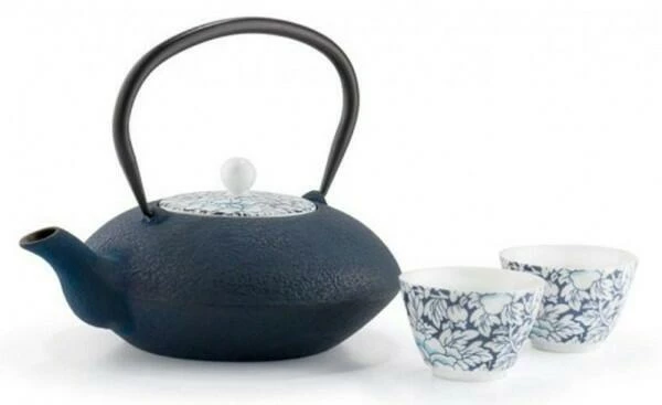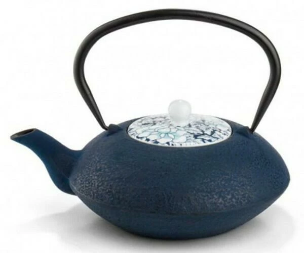 Die dunkelblaue Gusseisen-Teekanne von Bredemeijer nach japanischer Art zaubert Ihnen mit seiner ausgesprochenen eleganten, flachen Form ein wenig fernöstliches Flair in die Küche. Wie das Tüpfelchen auf dem „i“ schmückt ein Porzellandeckel mit blau-weißem Blumenmotiv die Teekanne, die innen mit Emaille glasiert ist. Zusätzlich enthält die Teekanne einen Edelstahlfilter, mit dem losen Tee einfach zubereitet werden kann. Durch das verwendete Gusseisen bleibt der Tee länger warm. Passend zur Teekanne sind Teetassen aus Porzellan zusätzlich erhältlich. Mit dieser Teekanne von Bredemeijer wird Tee trinken zum stilvollen Genuss auf höchstem Niveau, der Sie optimal auf die kühle Jahreszeit vorbereitet.