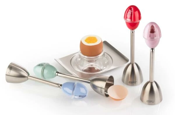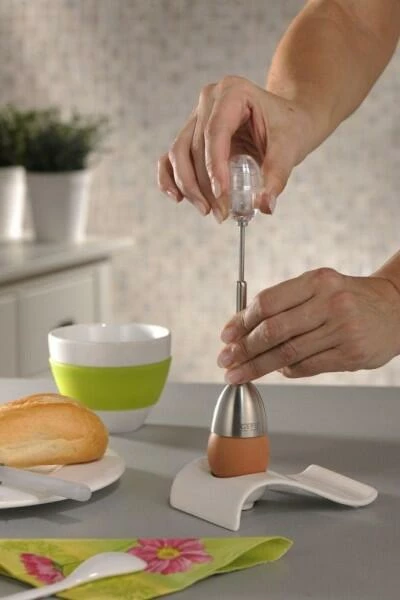 Und so leicht funktioniert es: Den Eierköpfer auf das Ei setzen (egal ob hart oder weich gekocht) die Kugel ziehen – zurückschnellen lassen und das Ei hat eine Bruchstelle erhalten. Nun noch den Eierschalenkopf abheben und genießen!